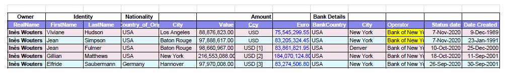 Als ze de curator is dan heeft Inès Wouters gebruik gemaakt van een valse identiteit om de opbrengst in een rekening te zetten onder de valse naam Germaine Colombier uit Sint-Jans-Molenbeek die op 17 december 2008 een rekening geopend heeft bij de Afriland First Bank Congo Democratique, waar ze 97.608.143 Euro zou hebben op dit moment. Zo zou de boete voor Dim’s Bakkerij gediend hebben om vrouwenverkrachtingen in Kivu daarmee te financieren en om via de Internationale Federatie van Rode Kruis- en Rode Halve Maan-verenigingen in Genève (Zwitserland) bij alle rijke landen aan te kloppen voor humanitaire hulp, medicijnen en chirurgisch materiaal voor “reparaties” te doen. Daarna laat ze alles op haar rekening bij de Crédit Suisse overschrijven om daarmee investeringen te doen zoals bakkerijen overnemen, om loverboys zoals Mohamed de Libanees die waarschijnlijk de opdracht van haar kregen om de dochter van de Marokkaans-Algerijnse bakkersfamilie te verleiden, om moordenaars als Joey the Midget te betalen, en om aandelen te kopen van in de auto-industrie zoals Audi, de farmaceutische sector bij Johnson en Johnson, en Bois Sauvage, Bekaert, Greenyard, Ontex, Titan Cement, AT&T, GE, Honeywell Inc. Manpower, Twitter, Air Liquid, Danone, Sodexo heb ik onder andere opgevangen.