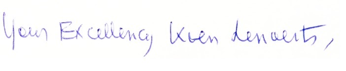 Ik dank u zeer, Edelachtbare heer Bart De Wever, Burgemeester van Stad Antwerpen, voor uw vriendelijke aandacht. Uw naam zal worden genoemd in de gebeden van vele gelovigen in 2 Neten, straat die niet weten wanneer ze warmte zullen krijgen of hoe dit verhaal zal eindigen..