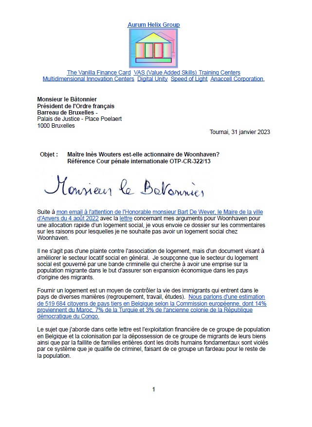 In mijn brief aan het Internationaal Strafhof in Den Haag heb ik dezelfde boodschap opgenomen voor alle Arabische landen zoals verder boven, namelijk dat ik ten zeerste aanbeveel iedereen met de naam Wouters, Wouterse, de Wouters, en andere varianten, te weren. Zij waren een vooraanstaande criminele familie die samenwerkte met de zogenaamde “Duitsers” die hele Joodse families de gaskamers en de ovens in leidden, en die geld verdienden met de verkoop van het onroerend goed van de uitgeroeide mensen. Historici noemen huizen in en rond de Pelikaanstraat in Antwerpen. Het volgt precies hetzelfde model van het stelen van de eigendommen van de bewoners van de sociale woningen van Woonhaven, die moeten aangeven welke en waar hun eigendommen buiten België staan. Asjemenou!