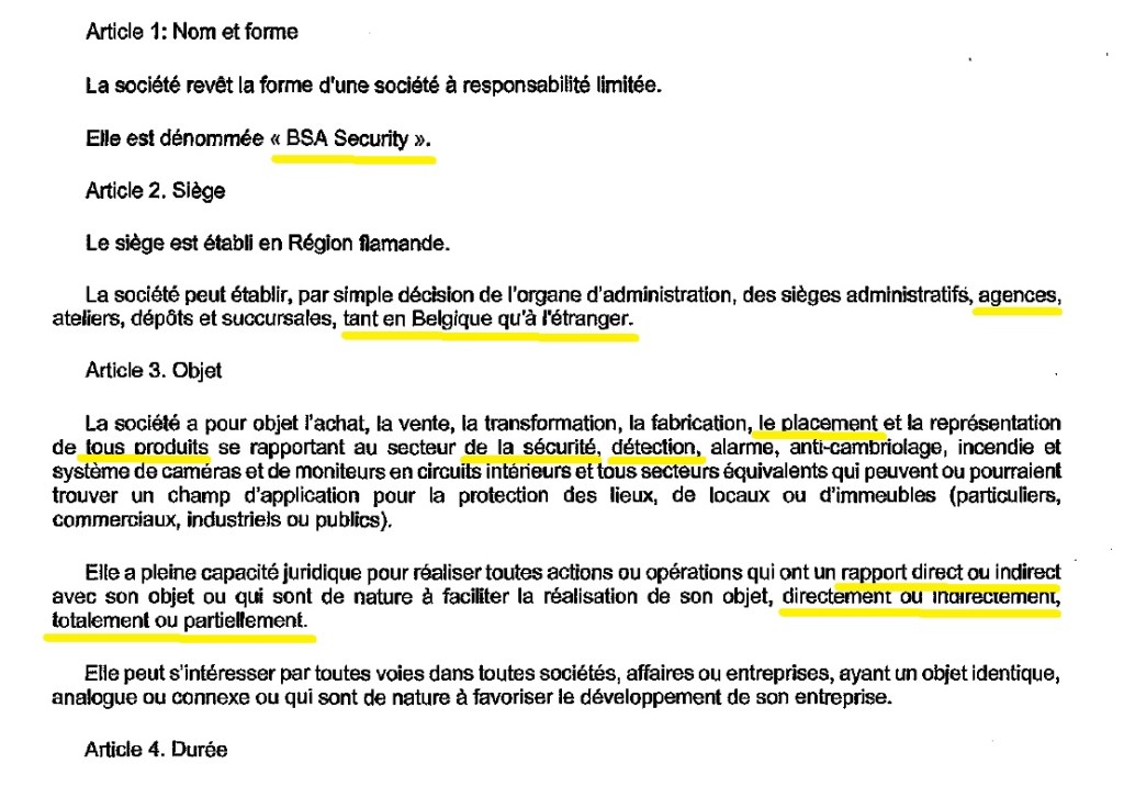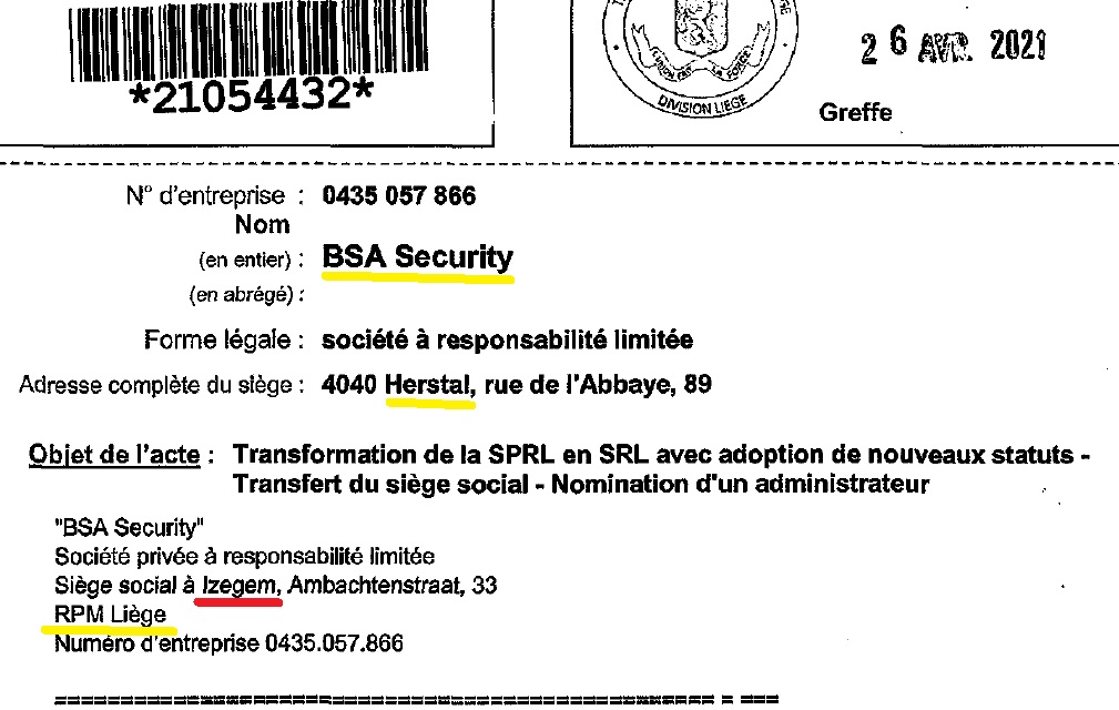 Una de estas empresas podría ser BSA Security. BSA Security, una empresa de servicios de seguridad ubicada en Herstal, con RPM (Registro de Personas Jurídicas) en Lieja (en Valonia) y su sede en Izegem (en Flandes), una configuración que atrajo nuestras sospechas ya que la jurisprudencia puede variar de una región a otra en Bélgica.