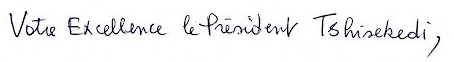 Veuillez recevoir, Votre Excellence Le Président Félix Tshisekedi mes sentiments respectueux et dévoués.