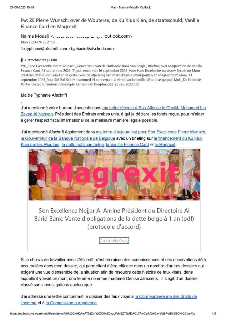 Deze hele zaak met betrekking tot de e-mail van typhanie@afschrift.com moet misschien beschouwd worden als een misdaadzaak, gezien de mogelijke hacking.De initialen van Isabella Willams zijn dezelfde als die van Inès Wouters, en zouden worden gebruikt als identificatie, over hoe te herkennen dat zij het is door familieleden en de rest van haar bende, veronderstel ik. In mijn brief aan de Nationale Bank van België, die ik deelde met Afschrift, gaf ik aan dat de Wouterse over de hele wereld verspreid zijn, omdat ze een land ontvluchten zodra ze het gevoel hebben dat er jacht op ze wordt gemaakt.