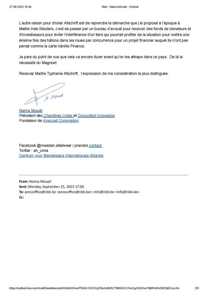 Mijn recente brief aan het Europees Hof voor de Rechten van de Mens waarin ik al mijn verdenkingen tegen advocaat Inès Wouters opsomde, namelijk dat zij of haar familie de cardiologische pomp wilden die Zijne Majesteit Koning Hassan II had uitgevonden en die na werd gemaakt aan het UCL Saint Luc universitair ziekenhuis in Brussel.