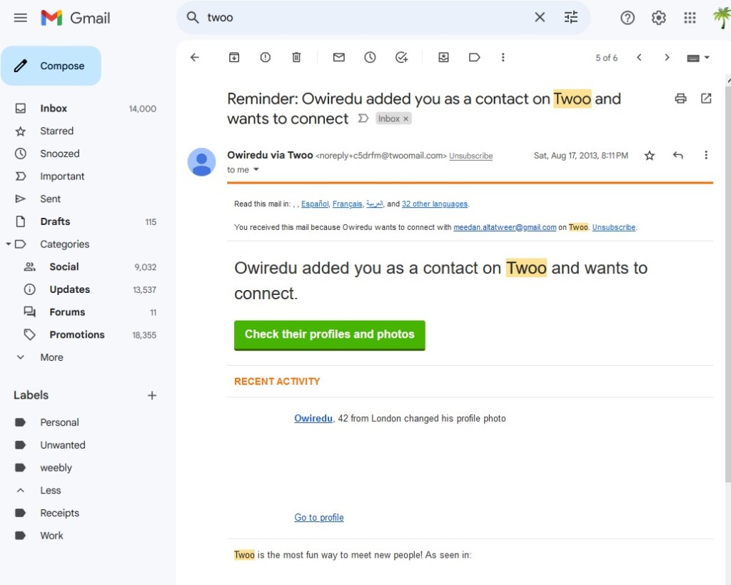 Something like this happened to me earlier, between 2012 and 2013, when I received a link to connect via Twoo to His Excellency Mohamed Brika, a Member of the Moroccan Parliament who met at the Youth for Human Rights conference of the United Nations in Brussels Twoo is a dating site headquartered in Gent. I searched it at that moment and this is why I will never forget that. The brand Twoo doesn’t exist anymore, but perhaps the dating activity continues.