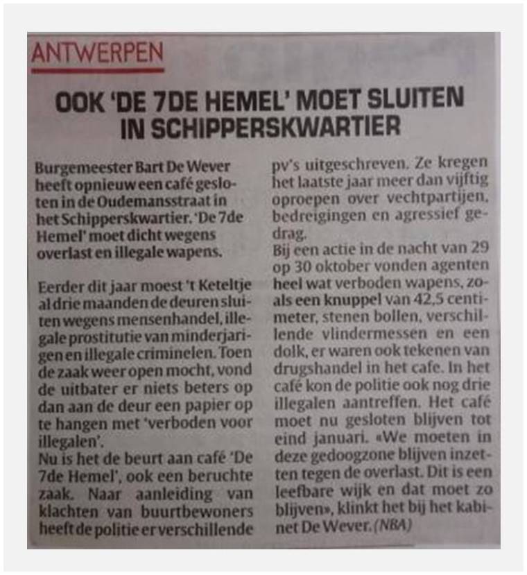 The newspaper article from Het Laatste Nieuws below shows a link between human traffic, prostitution, illegale weapon trade, drugs, and illegal migration. It’s about the shut down of a brothel which is located near the port of Antwerp, or at least near the very busy canal named “Schelde”. One can imagine that big boats arrive with men wanting to be trained in devouring the women. I remember that there was a time that big boats full of women from Thailand, the Philippines and Ghana were arriving for fulfilling only one purpose : sex-slavery.