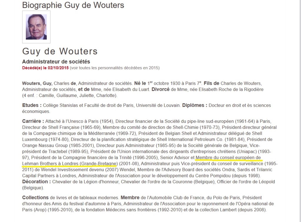 For what concerns the half brother through the father, Baron Guy Wouters van Oplinter, he joined the board of the Lehman Brothers Bank in London in 2000. That was after Lehman Brothers Bank in New York awarded large sums of loans for hotel industry infrastructure. I am discussing Baron Guy Wouters van Oplinter, in relation to the subprime mortgage crisis a little further. He used to be “administrateur d’entreprises”, overlooking the financing and management of a group of companies of which one could be Leemans Kredieten.