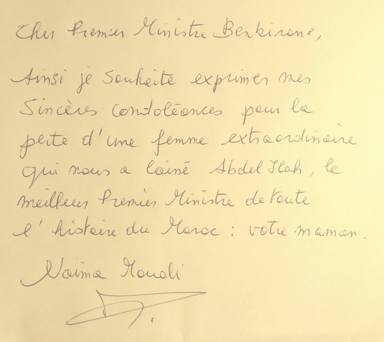 Ainsi je présente mes sincères condoléances à la famille Benkirane pour la perte d’une femme extraorinaire qui nous a laissé  Abdel Ilah Benkirane, le meilleur Premier Ministre de toute l’histoire du Maroc: sa maman.