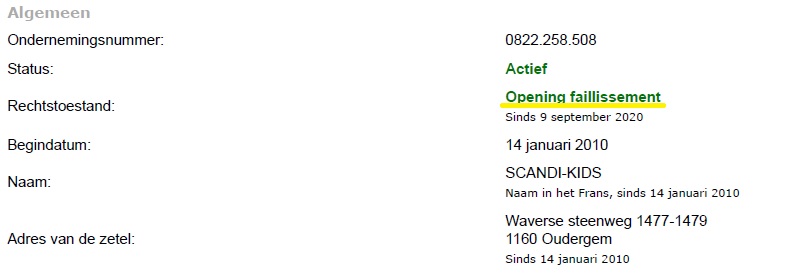 Ik heb over Scandi-Kids geschreven aan Hunne Majesteiten de Koning en de Koningin van België op 2 april 2020, dat zij mij wellicht hadden besmet met een Covid-19-achtige ziekte. 5 maanden later, op 9 september 2020, vraagt het bedrijf faillissement aan, zo blijkt uit hun bedrijfsgegevens.