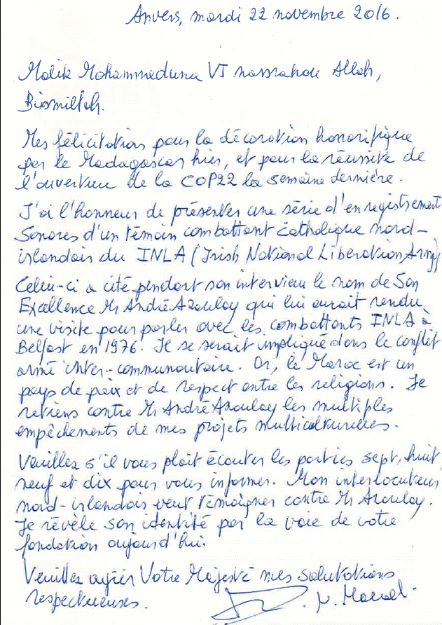 In this letter to His Gracious Majesty King Mohammed VI of Morocco I am announcing the series of Interviews with Padraige O’Hanlon, the INLA fighter from Northern Ireland. I am attracting His Majesty’s attention to tapes number 7, 8, 9 and 10 in which the name of Andre Azoulay is mentioned unfortunately. Now it looks as if Morocco had something to do with the conflict between Catholics and Protestants in Northern Ireland.